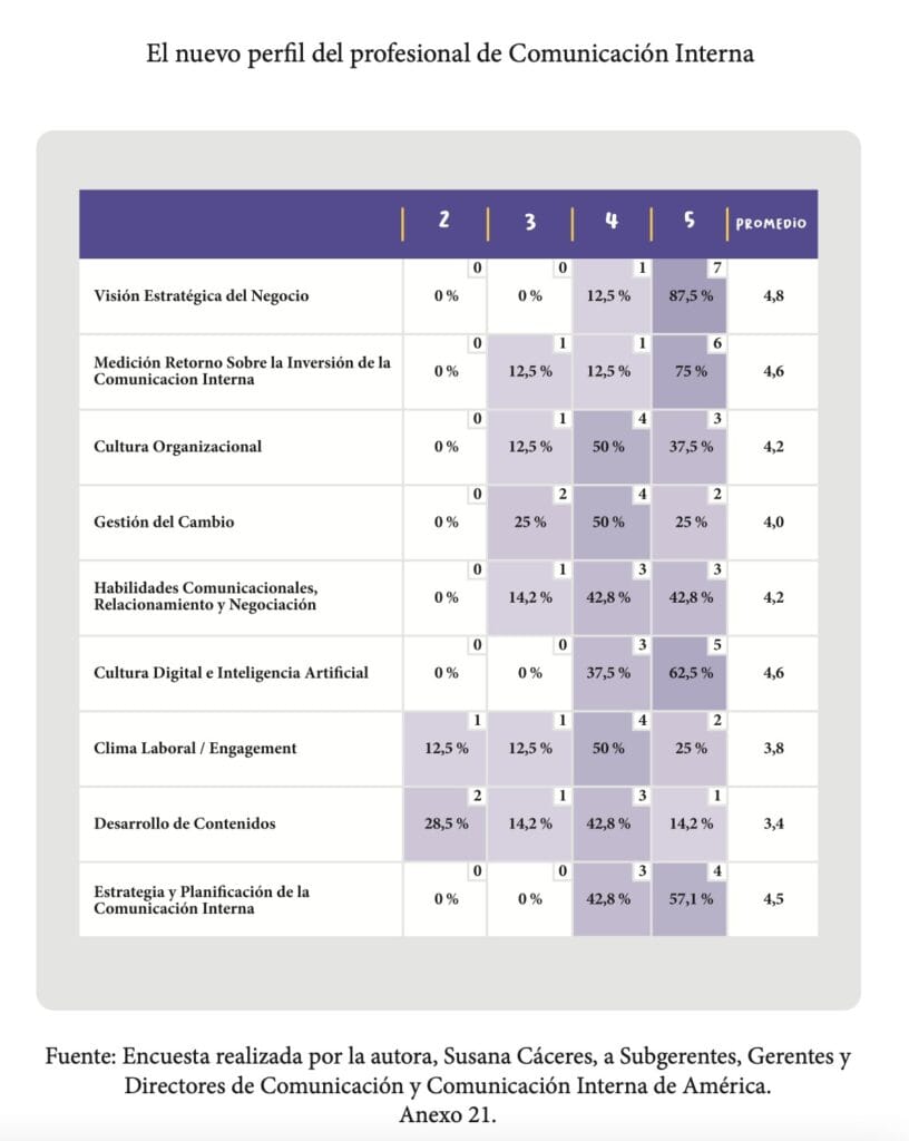 En mi libro “Cómo Medir la Efectividad y el Impacto de la Comunicación Interna y no Morir en el Intento” del año 2024, entrevisté a varios gerentes y subgerentes de comunicación interna de América Latina y les pregunté por las competencias más relevantes de un comunicador interno, para el Capítulo “El nuevo perfil del profesional de Comunicación Interna”. Este fue el resultado:
